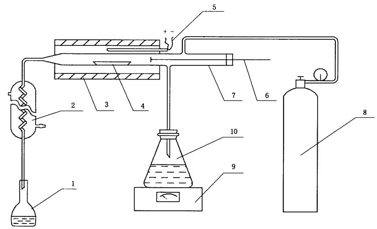 1-容量瓶;2-冷凝管;3-高溫爐;4-瓷舟;5-鉑銠一鉑熱電偶;6-進樣推棒;7-燃燒管;8-氧氣鋼瓶;9-調溫電爐;10 -平底磨口燒瓶。 按圖所示裝配好全套儀器,連接好電路、氣路和水路各個系統,將高溫爐升溫到1100℃。往燒瓶中加入約300 mL水并加熱至沸騰,冷凝管通入冷水。塞緊進樣推棒硅膠塞,在平底燒瓶中水沸騰之前通人氧氣,調節氧氣流量為400 mL/min,檢查系統不漏氣后,通入水蒸氣和氧氣空蒸15 min。 操作試驗步驟 稱取(0.50±0.01)g 一般分析試驗煤樣(稱準至0.1 mg)和0.5 g石英砂放在瓷舟里小心混合均勻,再用約0.5 g石英砂鋪蓋在上面。將100 mL容量瓶放在冷凝管下端接收冷凝液。取下進樣推桿,把瓷舟放入燃燒管內,插入進樣推桿,塞緊硅膠塞。將瓷舟的前端推到預先測好的約300℃區域停留5 分鐘,接著推進到約600℃區停留5分鐘,再推進到約900℃區停留5分鐘,最后把瓷舟推到1100℃的恒溫區,拔出進樣推桿以免融化,樣品在恒溫區繼續燃燒分解15分鐘。在整個操作過程中,調節燒杯內水的蒸發量,水解開始15分鐘內,容量瓶中每分鐘收集約3mL,后15分鐘,每分鐘收集約2.5 mL,最后總體積應控制在85 mL以內。燃燒-水解完成后,移走容量瓶。停止通氧氣,取下送樣推棒,取出燃燒舟。 測量電位 在100 mL燒杯中加入一定量的水,連接好電位測量裝置,開動攪拌器,更換燒杯中水數次,直至毫伏計顯示的電位值達到氟電極的空白電位。 在5個用水沖洗過的100 mL容量瓶中,分別加入100 ug/mL的氟標準工作溶液1 mL,3 mL,5mL,7 mL,10 mL,加入3滴溴甲酚綠指示劑,10 mL總離子強度調節緩沖溶液,用水稀釋到刻度,搖勻,靜置30分鐘。 計算結果: 煤中氟的含量(Fad)按下面公式)計算,測定結果修約到個位。